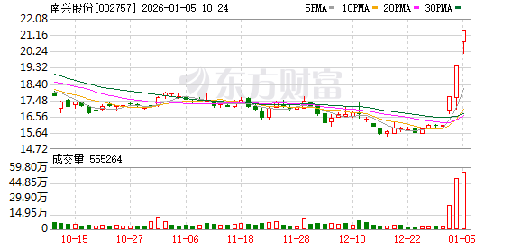 南兴股份盘中涨停,已连收3个涨停板,截至9:35,该股报21.42元,换手率15.81%,成交量4460.52万股,成交金额9.39亿元,涨停板封单金额为2.02亿元。连续涨停期间,该股累计上涨33.13%,累计换手率为41.49%。最新A股总市值达63.29亿元,A股流通市值60.42亿元。